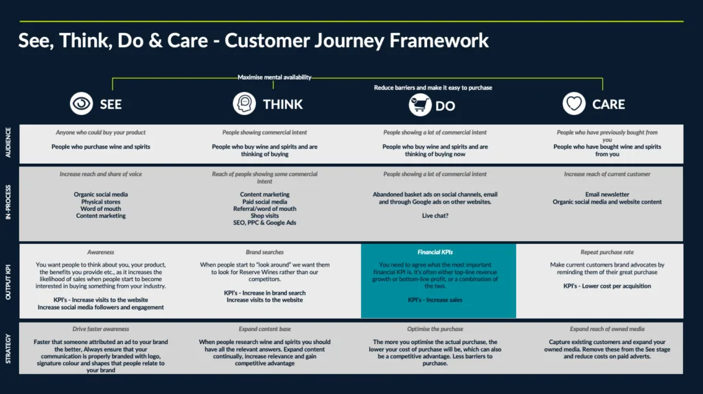 The ‘See-Think-Do-Care’ framework stands out from traditional sales funnels by recognising that the customer journey is more complex and less linear than previously thought. It also incorporates the critical element of post-purchase engagement, often overlooked in other models.